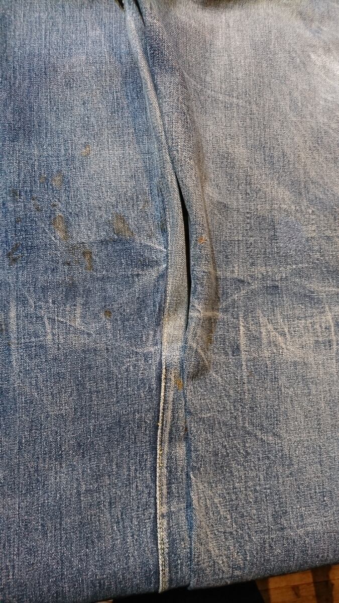 針刺しシンチバックや剥き出しリベット、赤タブなし、カモメ型のステッチ、ビーフジャーキーの様なレザーパッチなど興味深いディテールが満載でこの年代にしか出せないオーラを感じます。
