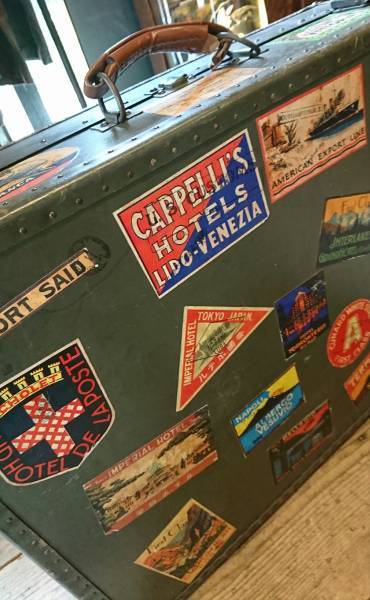 世界中のホテルのステッカーが貼ってあり、当時のデザインや書体など大変希少で興味深いです。