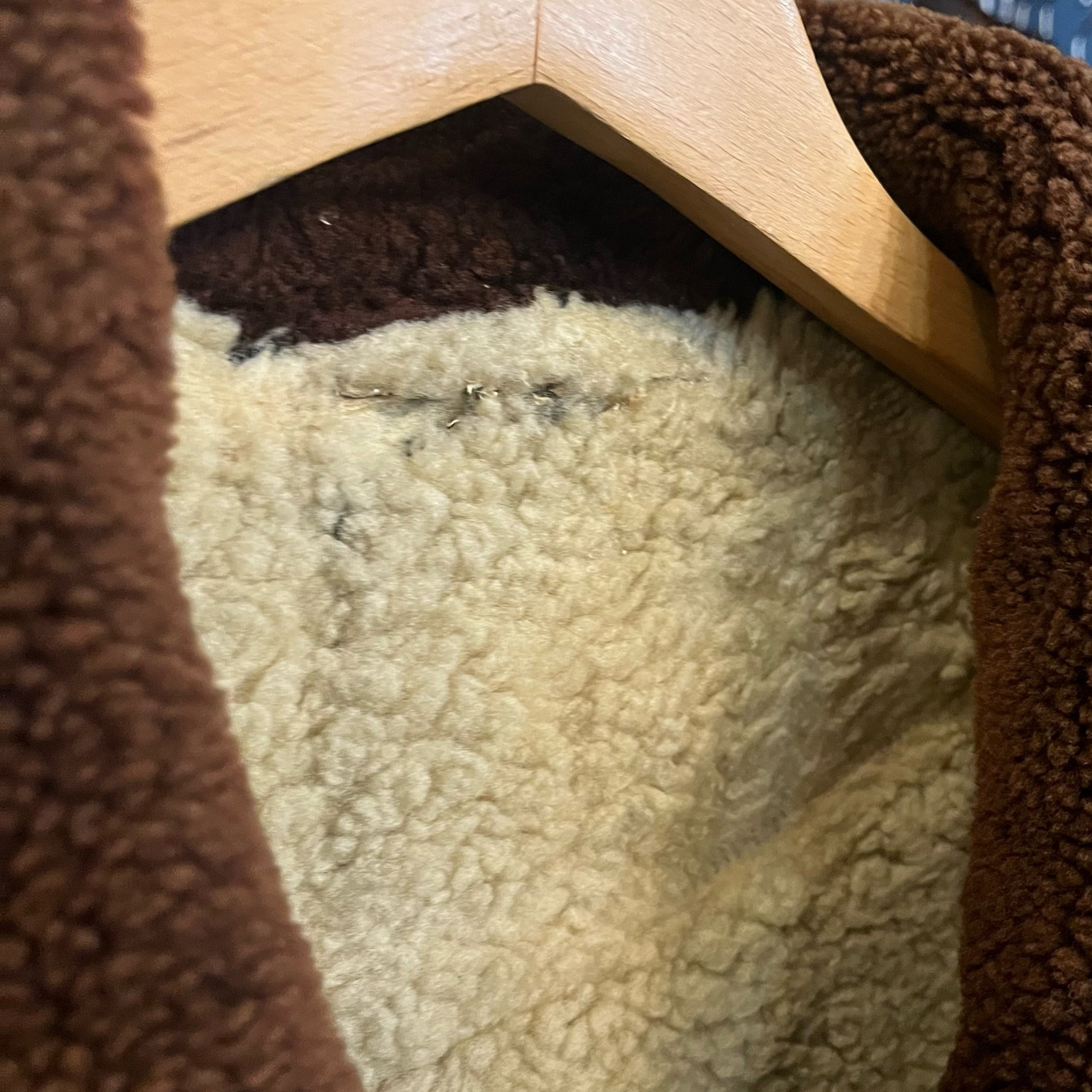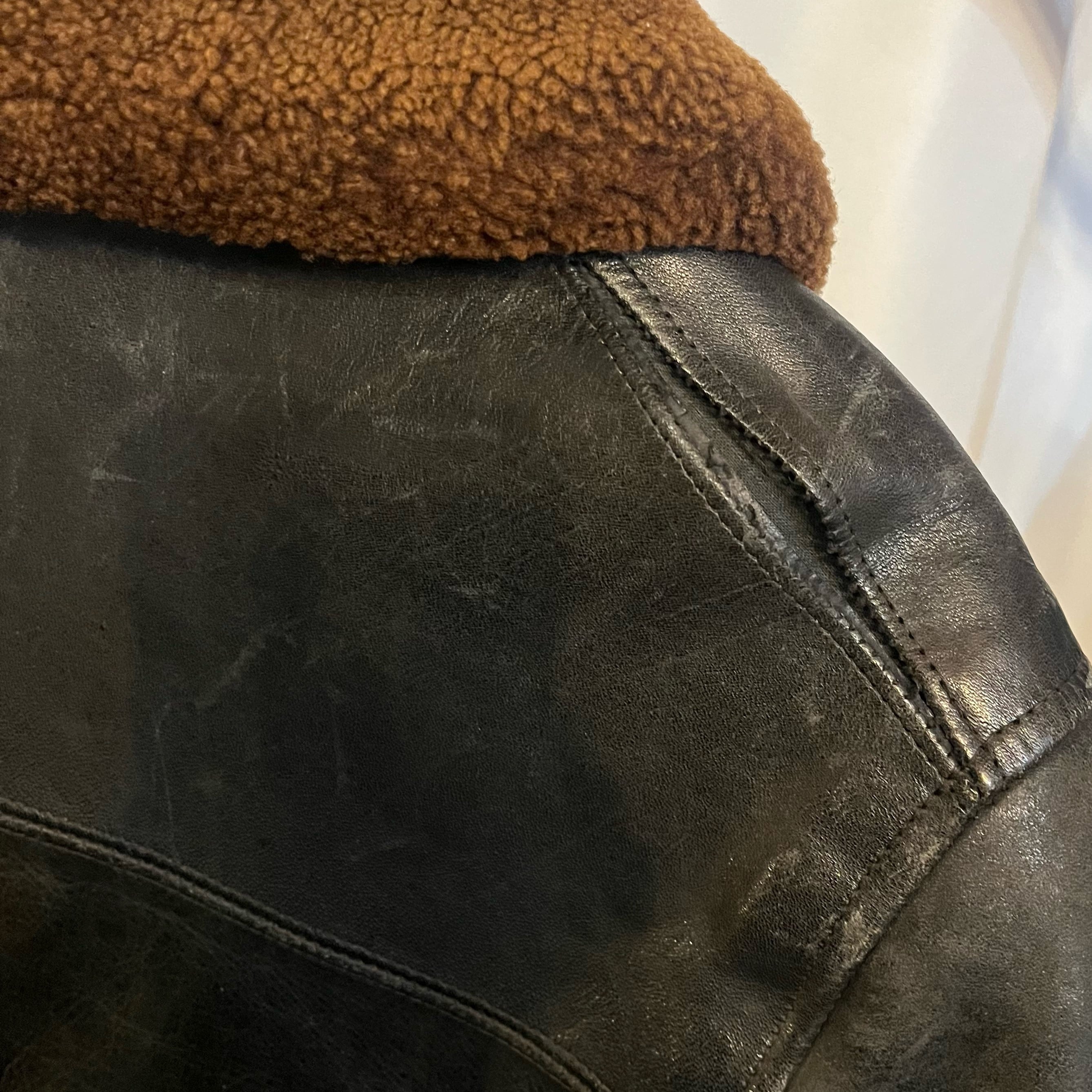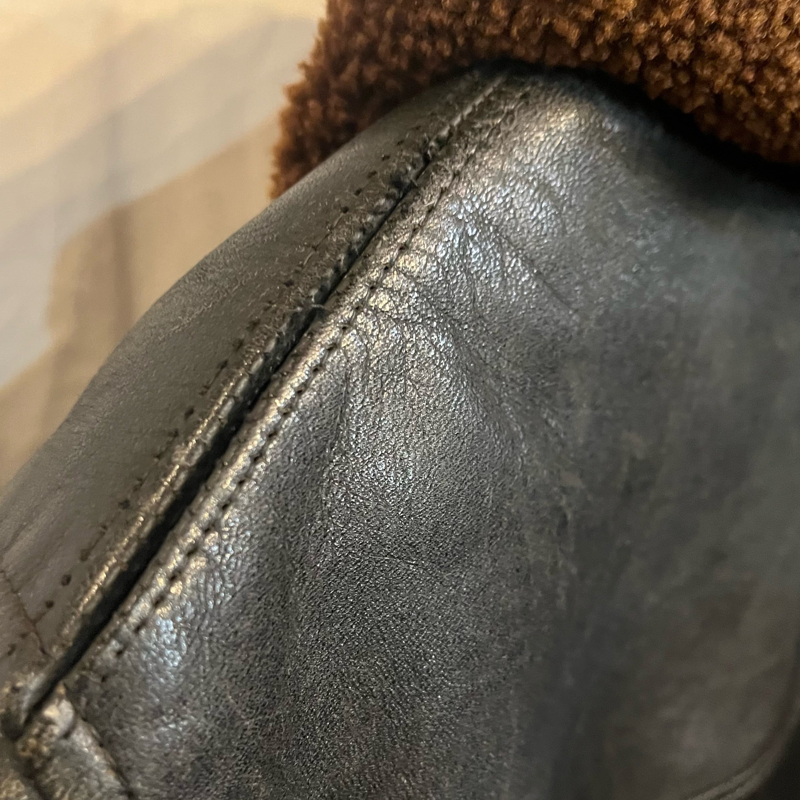 肩のステッチのホツレ、ムートンの若干の剥がれなどは見られますが着用に問題はありません。レザーも硬化なども無く良い状態です。