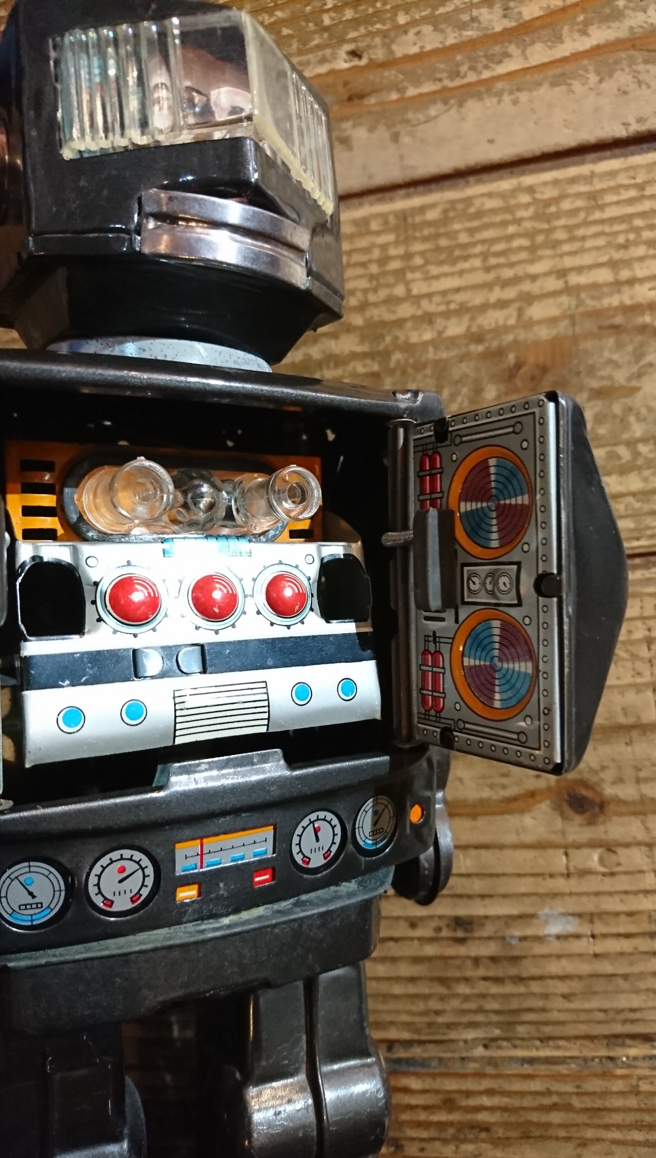 電池で動きしばらく歩くと胸部分が開きマシンガンが光る仕組みですが、動作は確認していません。