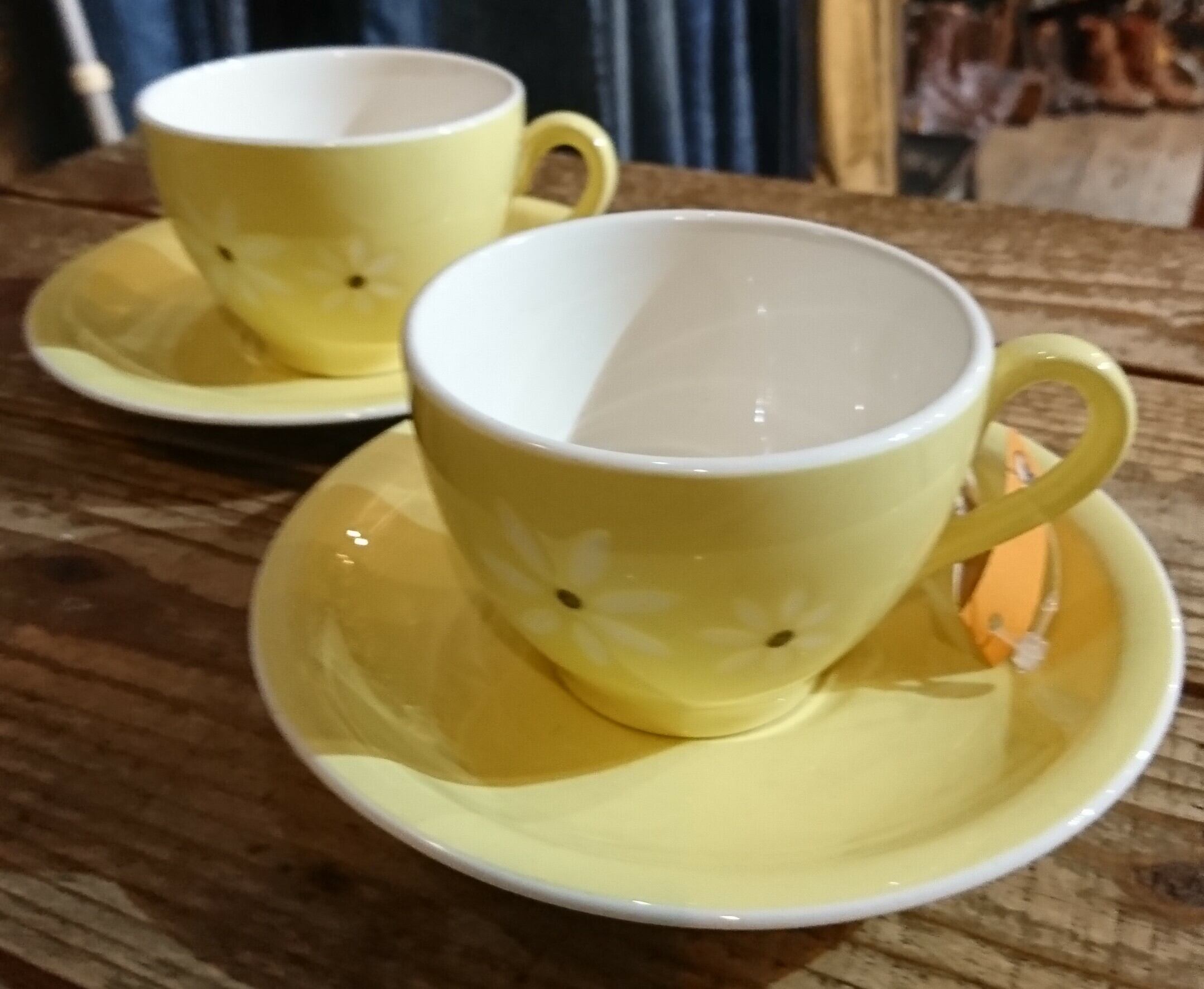 レモンイエローに白い花柄のお洒落なカップ&ソーサーです。