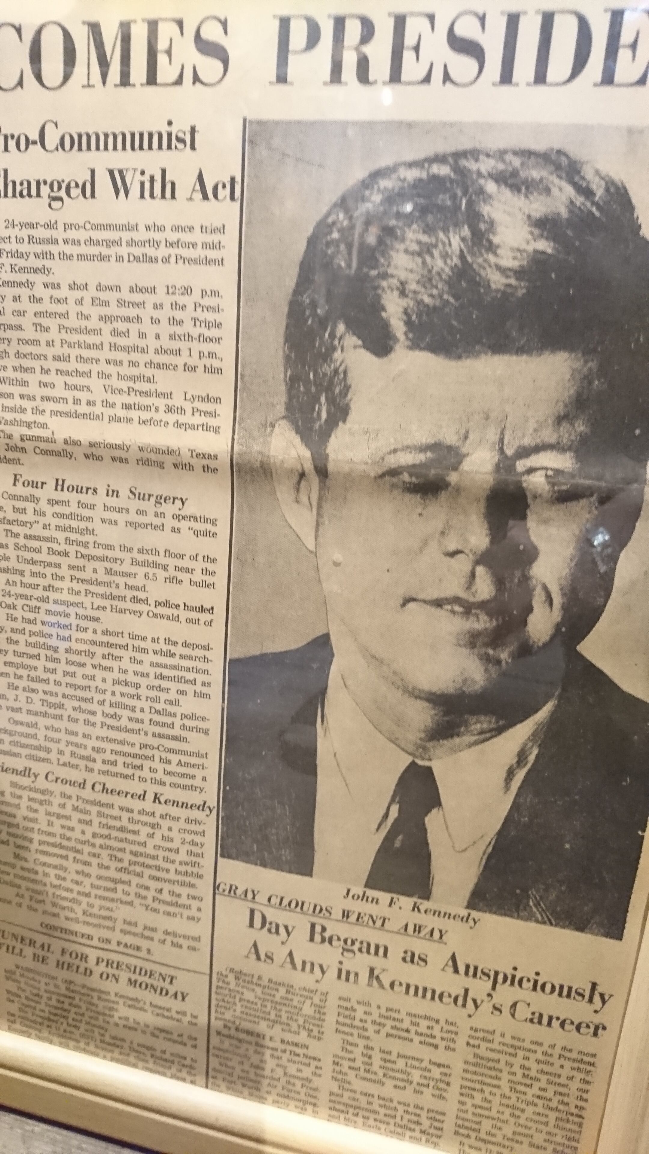 ケネディ 大統領 暗殺事件の当時の新聞の一部を額に入れたものです。