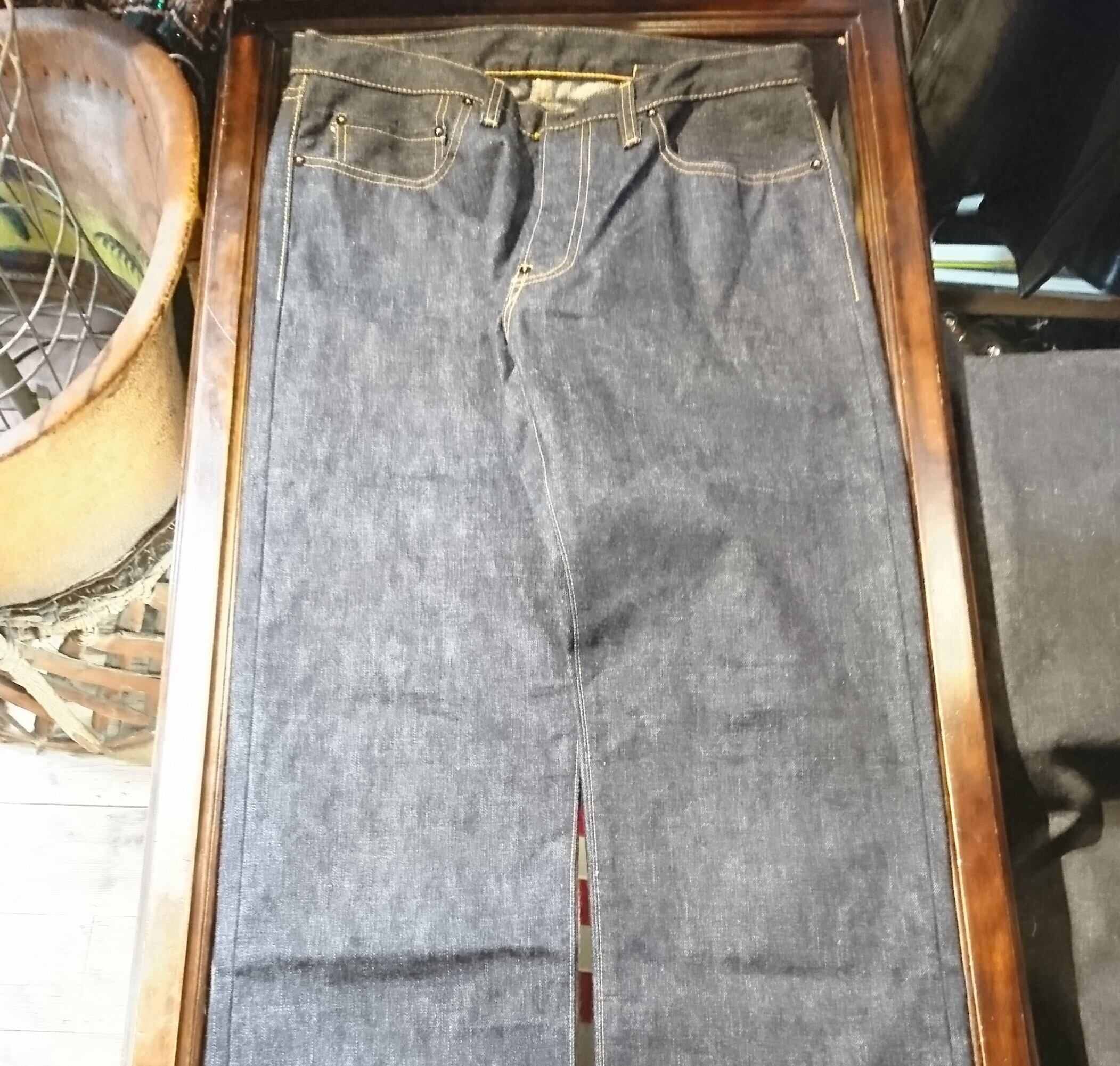 1936年頃のデニムパンツをベースに黒ラッカー塗りドーナツボタンや針刺しシンチバック、レザーパッチ等細部まで拘って作られています。