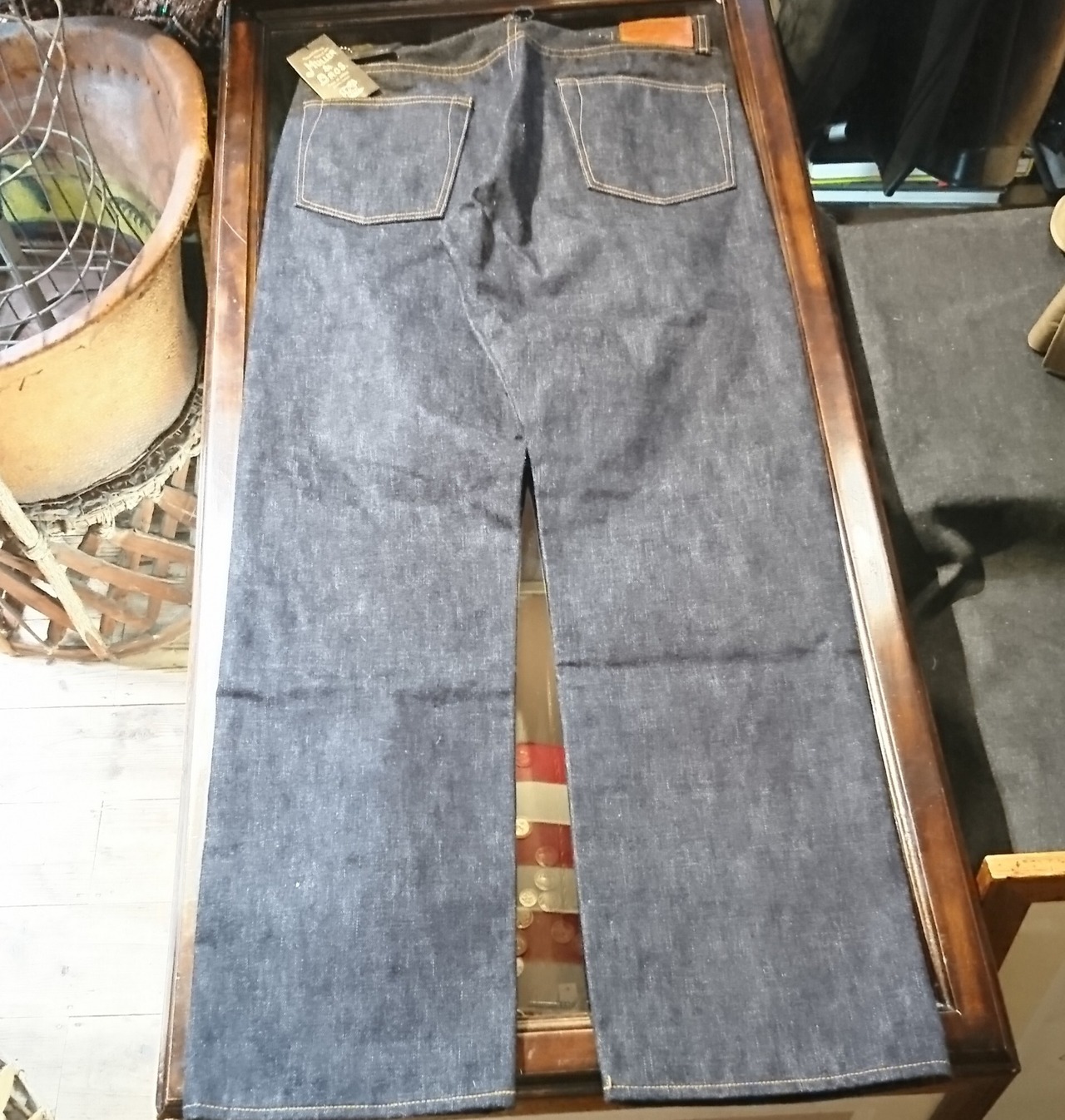 1936年頃のデニムパンツをベースに黒ラッカー塗りドーナツボタンや針刺しシンチバック、レザーパッチ等細部まで拘って作られています。