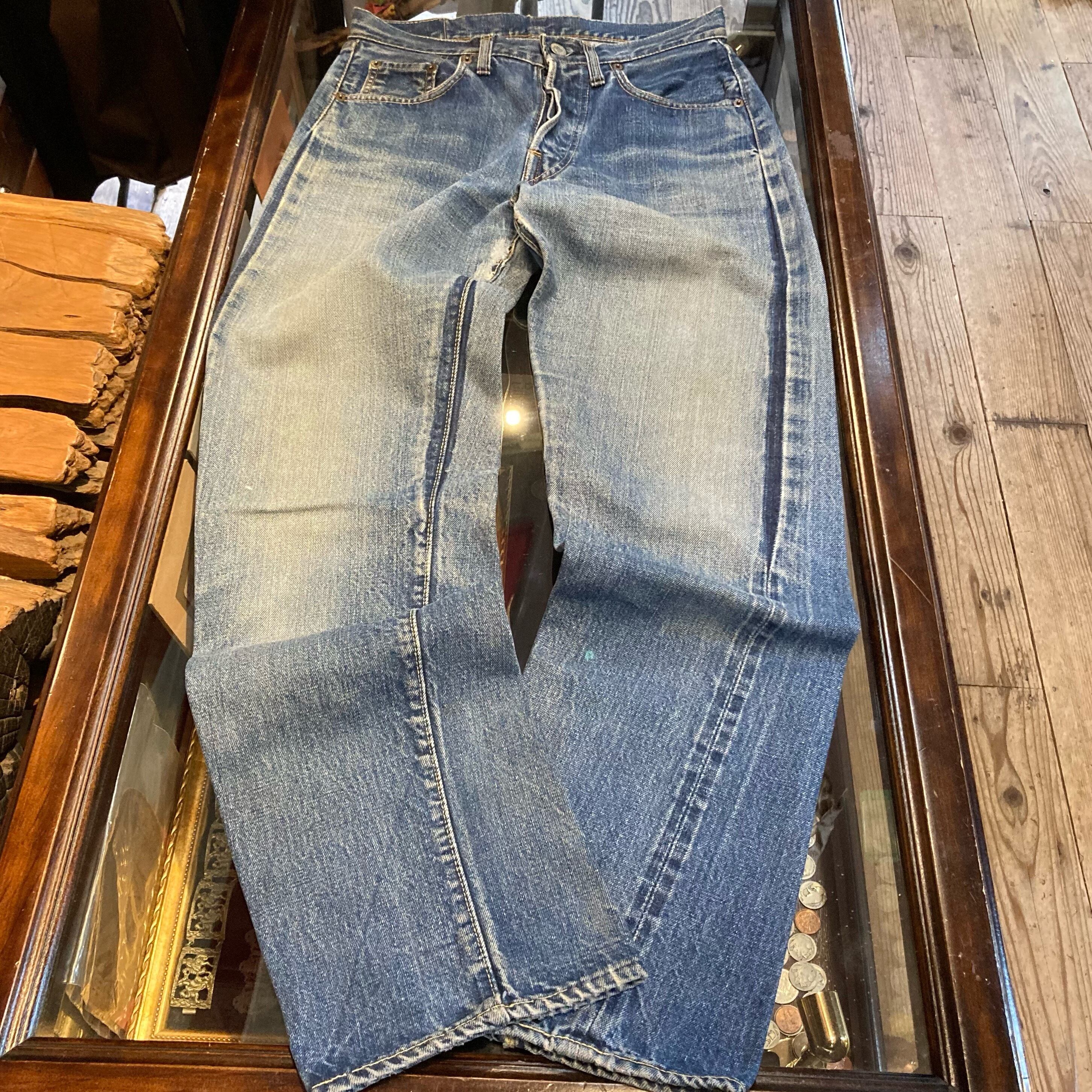 画像のようにシルエットを変えて穿かれたような色が濃くなっている部分や股付近にリペアなどがみられます。